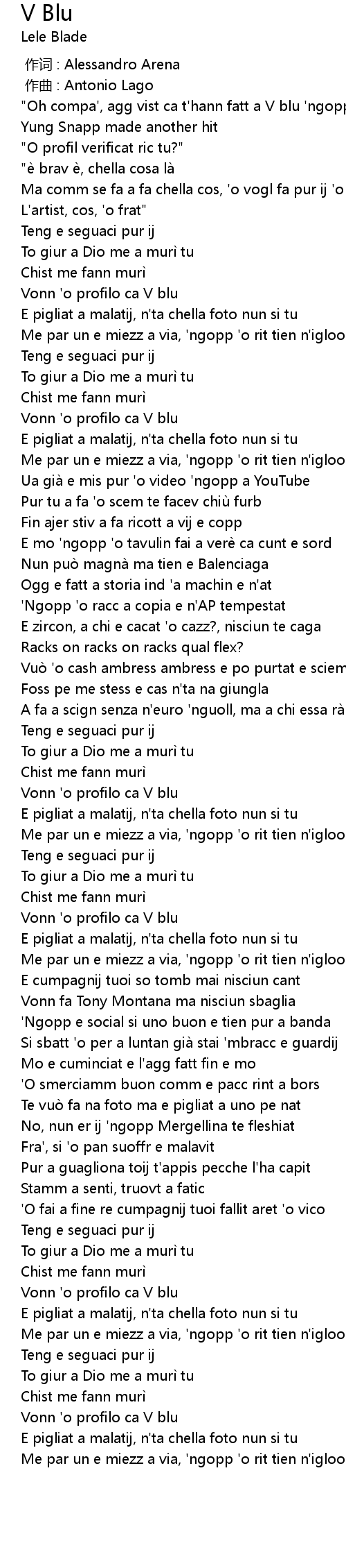| [01:10.81] | A fa a scign senza n' euro ' nguoll, ma a chi essa rà cunt? |