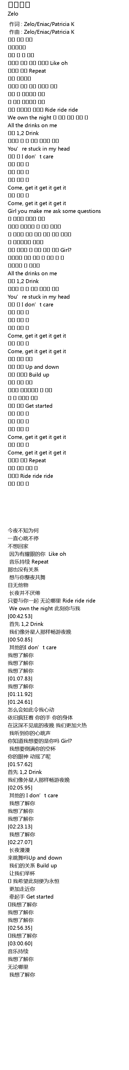 | [00:00.00] | zuo ci : Zelo Eniac Patricia K |