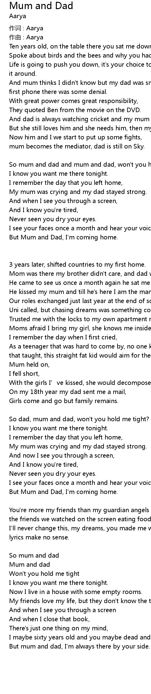 | So mum and dad and mum and dad, won't you hold me tight? | |