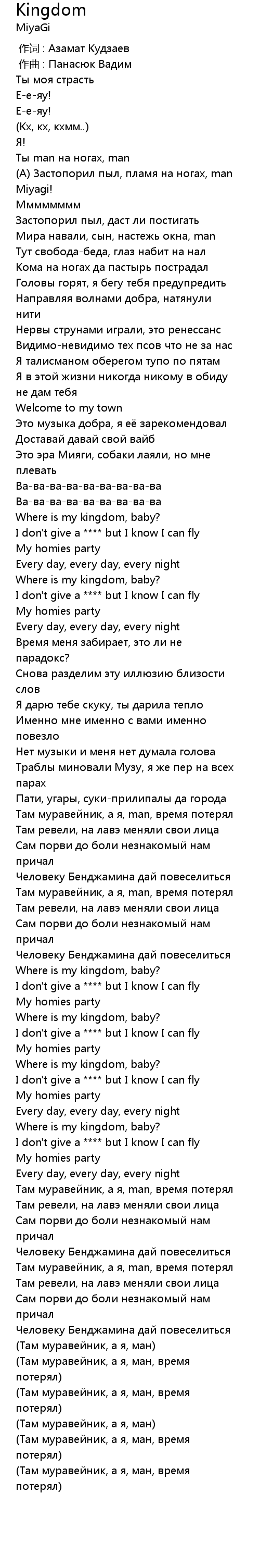 | [02:10.19] | Where is my kingdom, baby? |