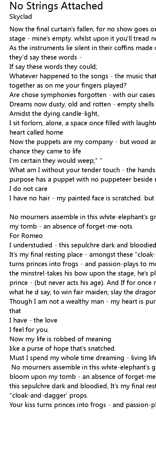I have no hair - my painted face is scratched. but fear my wooden heart will shatter with no stings attached. [CHORUS:] |