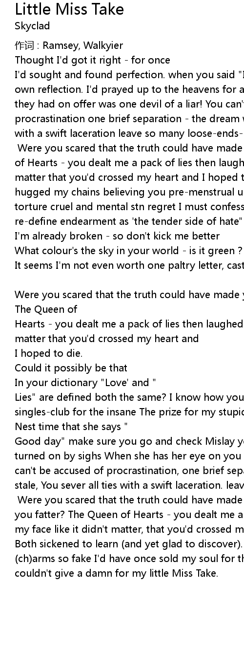 | Good day" make sure you go and check Mislay your smile this dacryphile is turned on by sighs When she has her eye on you good fortune and good flies You can' t be accused of procrastination, one brief separation the dream went stale, You sever all ties with a swift laceration. leave so many looseends thereby hangs my tale. CHORUS Were you scared that the truth could have made you fatter? The Queen of Hearts you dealt me a pack of lies, then laughed in my face like it didn' t matter, that you' d crossed my head and I hoped to die Both sickened to learn and yet glad to discover. that Venus once held me with ch arms so fake I' d have once sold my soul for this faithless lover, now I couldn' t give a damn for my little Miss Take. |