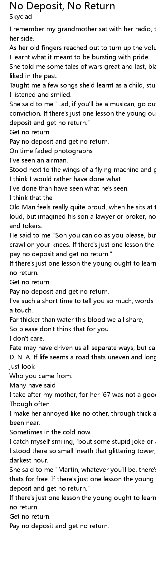 He said to me "Son you can do as you please, but always stand stright - never crawl on your knees. If there's just one lesson the young ought to learn, it's pay no deposit and get no return." |