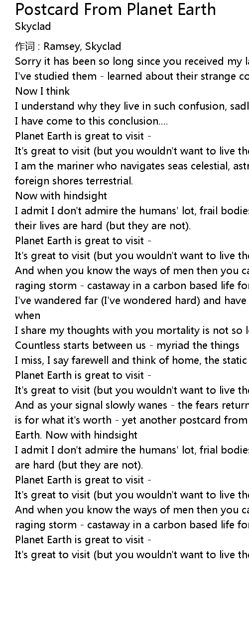 | And as your signal slowly wanes the fears return my growing pains, here it is for what it' s worth yet another postcard from planet | |