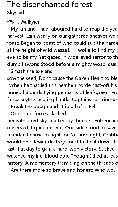 | The Farm Hand' s Ghost: " My kin and I had laboured hard to reap the yearly harvest. Lain weary on our gathered sheaves we cracked a vat of ale. Poured a toast Began to boast of who could sup the hardest. Slumped in drunken slumber at the height of wild wassail.... I woke to find my brothers gone that Autumn eve so balmy. Yet gazed in wideeyed terror to the barley fields nearby. Struck dumb I swore Stood before a mighty woadduabed army. Believed my wits deceived me ' til I heard their battlecry." The Lord Of The Trees: " Smash the axe and sow the seed Don' t cause the Oaken Heart to bleed!" The Farm Hands Ghost: " When he that led this heathen horde castoff his ivy mantle Cohorts raised honed halberds flying pennants of leafgreen. From below approached the foe A fierce scythebearing hantle. Captains sat triumphant upon coughing, steel machines." The Forces Of Progress: " Break the bough and strip all of it. Fell this forest, make a profit!" The Farm Hands Ghost: " Opposing forces clashed beneath a red sky cracked by thunder. Entrenched beneath the hedgerow I' d observed it quite unseen. One side stood to save the wood: T' other planned it' s plunder, I chose to fight for Nature' s right Grabbed a fallen skean. All who would one flower destroy, must first cut down this Didycoy! We fought until the last that day to gain a hardwon victory, Sucked in by the thirsty earth I watched my lifeblood ebb. Though I died at least I' d tried to play some part in history A momentary trembling on the threads of Wyrd' s web." The Lord Of The Trees: " Are there more so brave and honest Who would die to save my forest?" |
