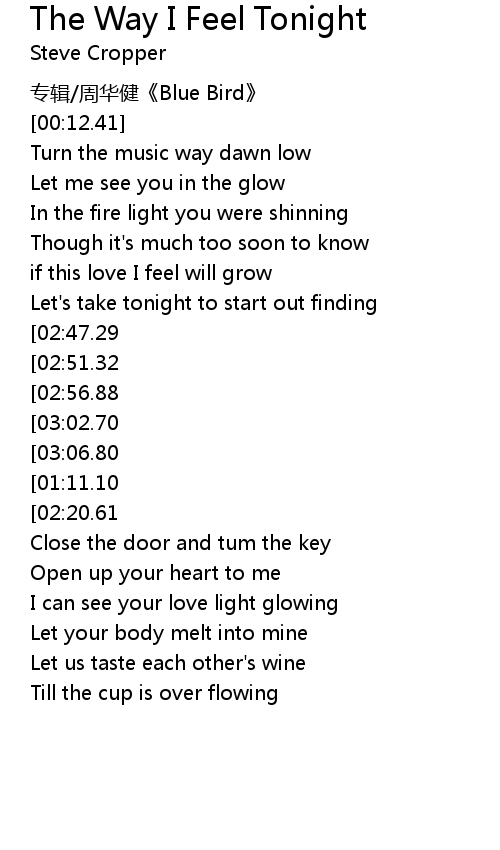 | [03:18.32][02:47.29][01:48.87][00:46.50] | Cause the way I feel tonight |