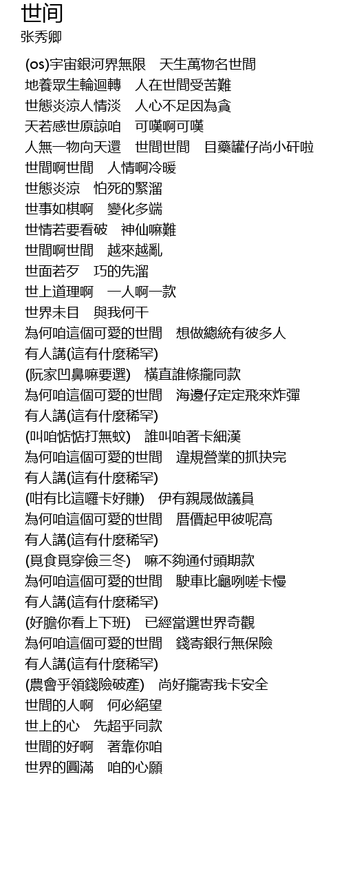 | 為何咱這個可愛的世間 駛車比龜咧嗟卡慢 | |