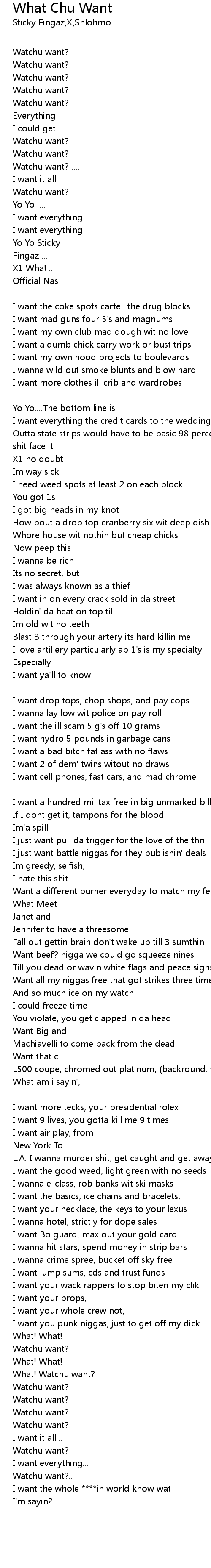 I want a crack house so fiends could black out [Sticky Fingaz] |