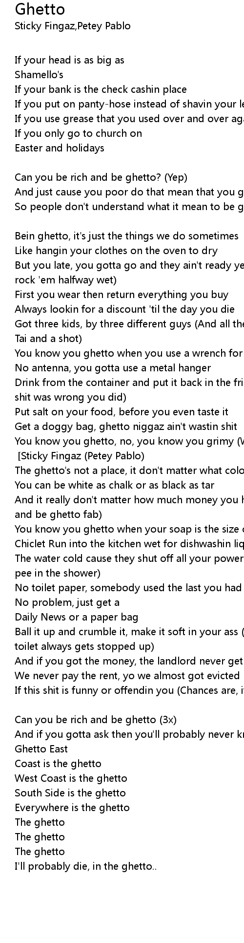 You know you ghetto, no, you know you grimy (When you iron dirty pants 'til them shits get shiny) [Chorus 2x] [Sticky Fingaz (Petey Pablo)] |