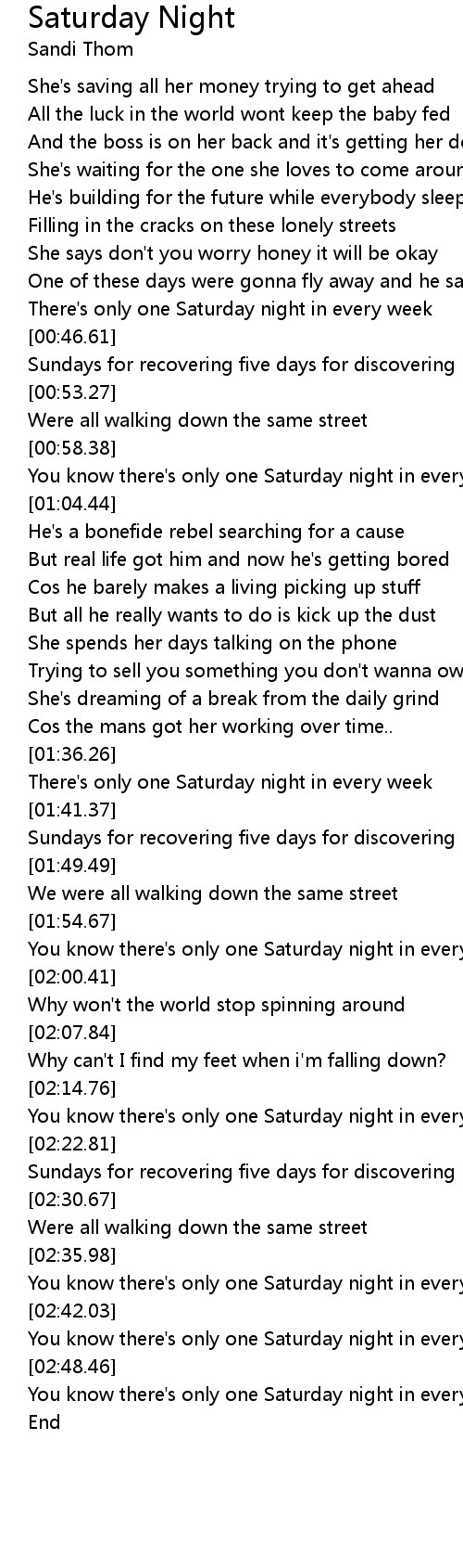 | [02:44.53] | You know there' s only one Saturday night in every week |