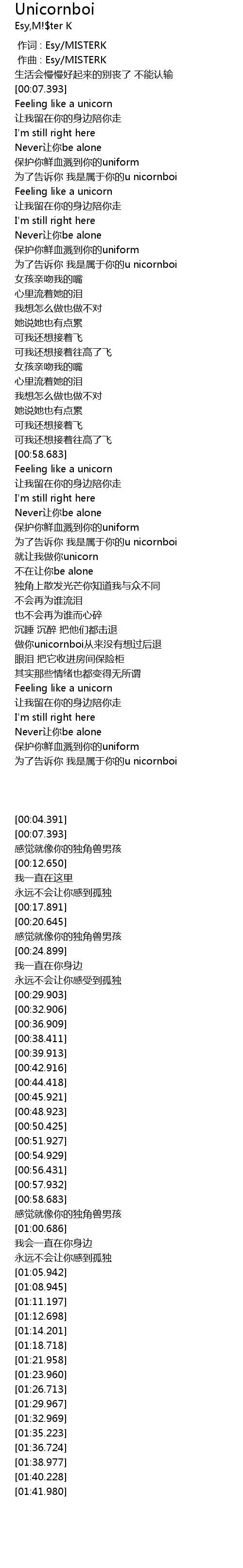 | [00:20.645] | wèi le gào sù nǐ wǒ shì shǔ yú nǐ de u nicornboi |