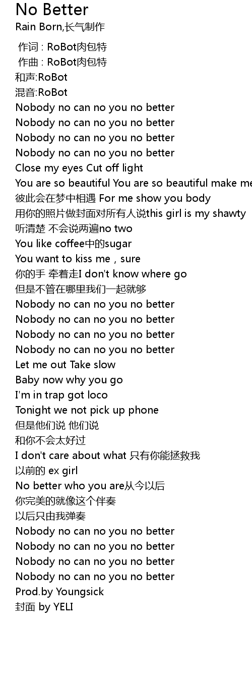 | [02:31.08] | Nobody no can no you no better |