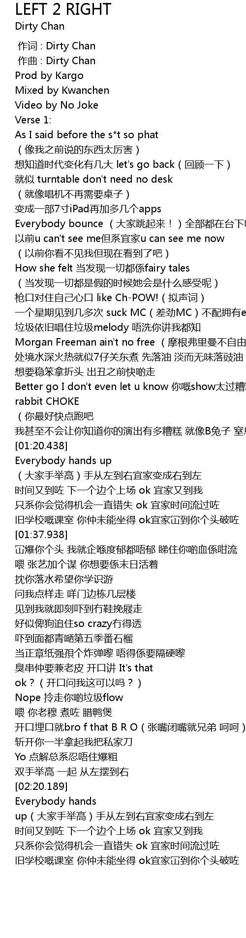 | [01:15.952] | Better go I don't even let u know 你嘅show太过糟糕就似B rabbit CHOKE |