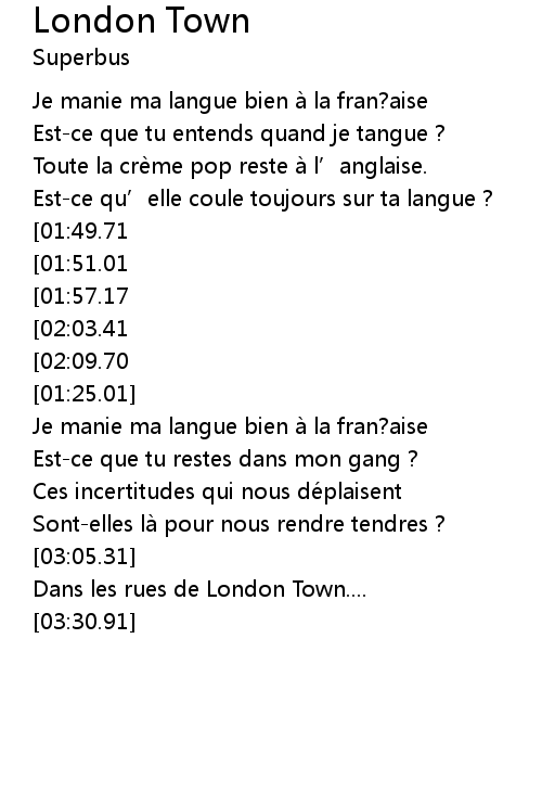 | [02:59.60][02:09.70][01:19.84] | Dans les rues de London Town |