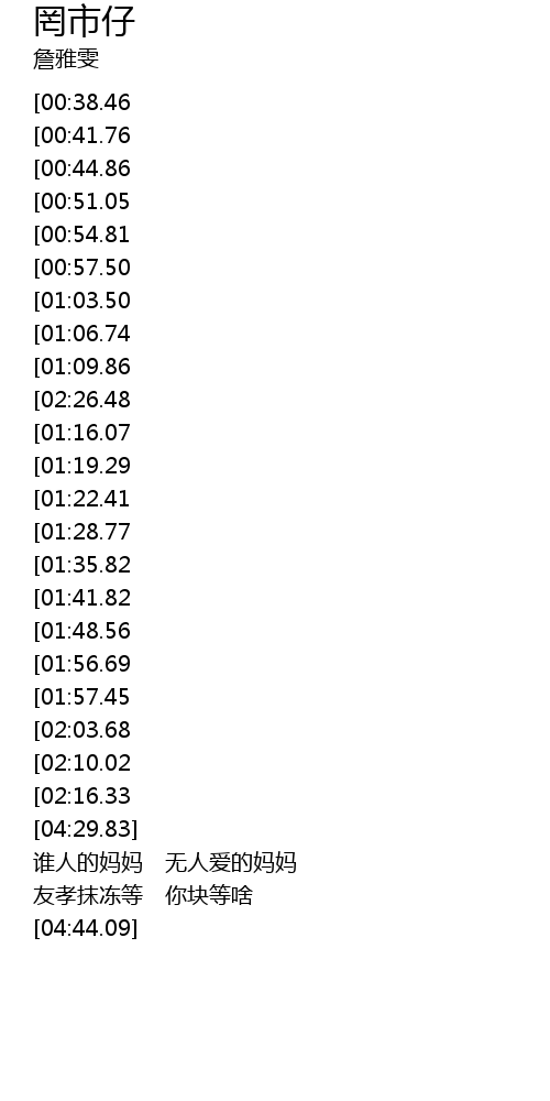 | [04:05.22][01:57.45] | 谁人的妈妈 无人爱的妈妈 |
