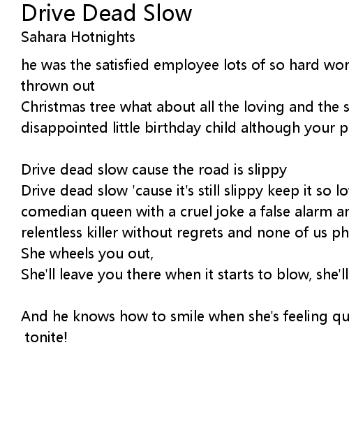 Drive dead slow 'cause it's still slippy keep it so low tonight she's the comedian queen with a cruel joke a false alarm and a poisoned coke the relentless killer without regrets and none of us phone to say: what a threat |