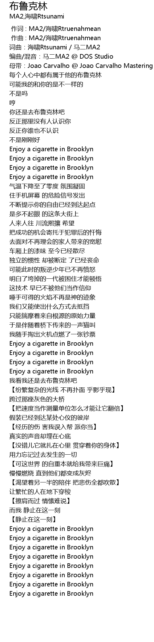 | [00:02.193] | 词曲:海啸Rtsunami / 马二MA2 |