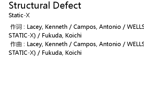 | [00:00.000] | 作词 : Lacey, Kenneth / Campos, Antonio / WELLS, WAYNE R. (NOT STATIC-X) / Fukuda, Koichi |