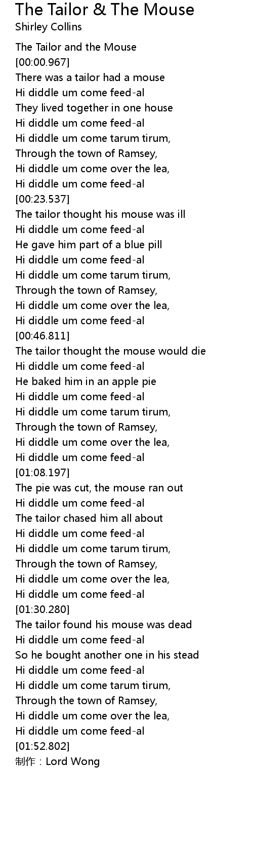 | [01:11.511] | The pie was cut, the mouse ran out |