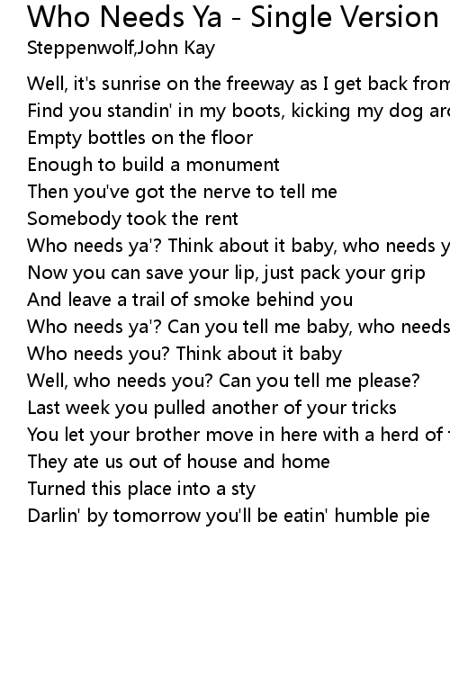 | Who needs ya'? Can you tell me baby, who needs you? | |