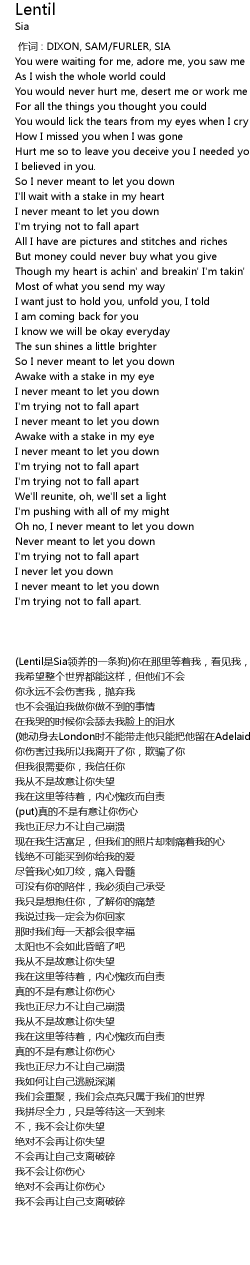 | [00:00.00] | 作词 : DIXON, SAM/FURLER, SIA |