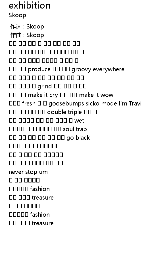 | [00:40.085] | 여전히 fresh 한 넌 goosebumps sicko mode I'm Travis Scott |