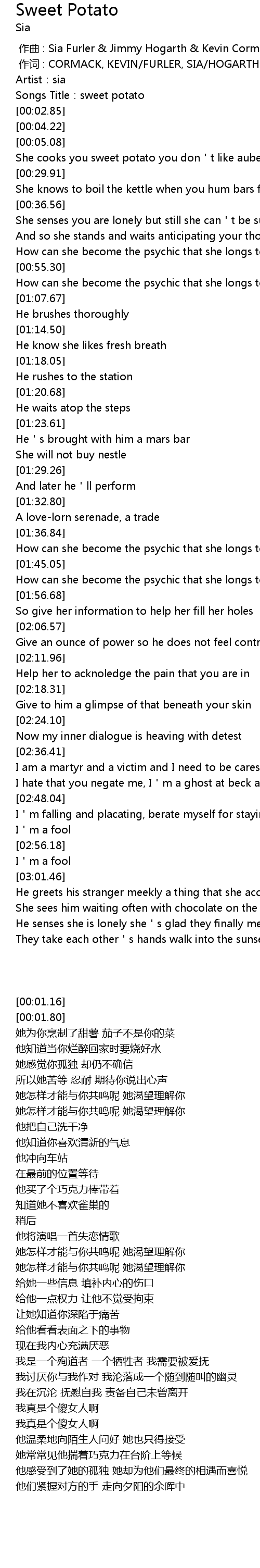 | [00:01.80] | Songs Title:sweet potato |