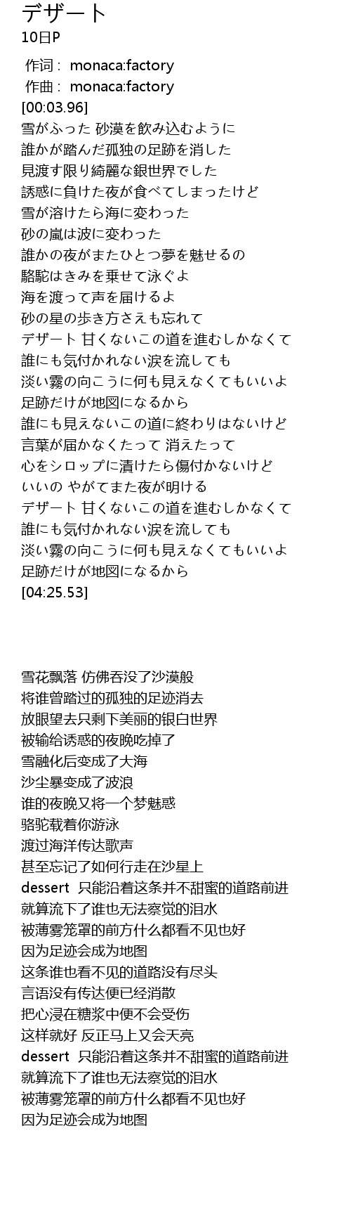 | [00:16.01] | 雪がふった 砂漠を飲み込むように |