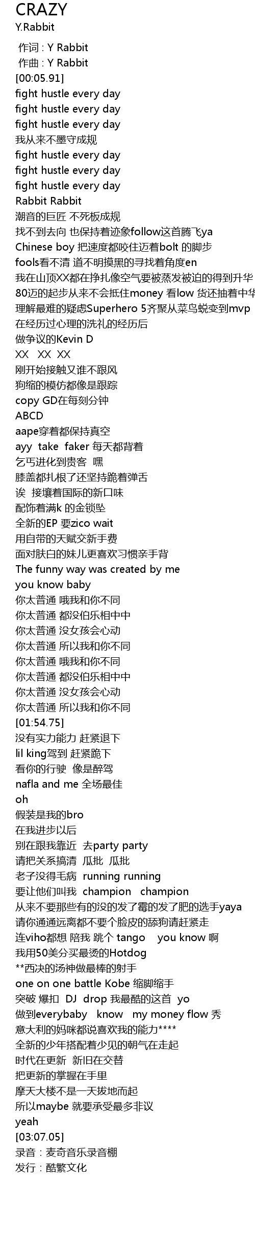 | [00:01.00] | zuò qǔ : Y Rabbit |