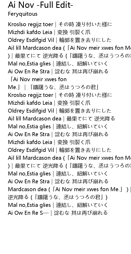 | [03:46.008] | Ail lill Mardcason dea (「Ai Nov meir xwes fon Me.」 )|最果てにて 逆光降る (「躊躇うな、丞はうつろの君」) |