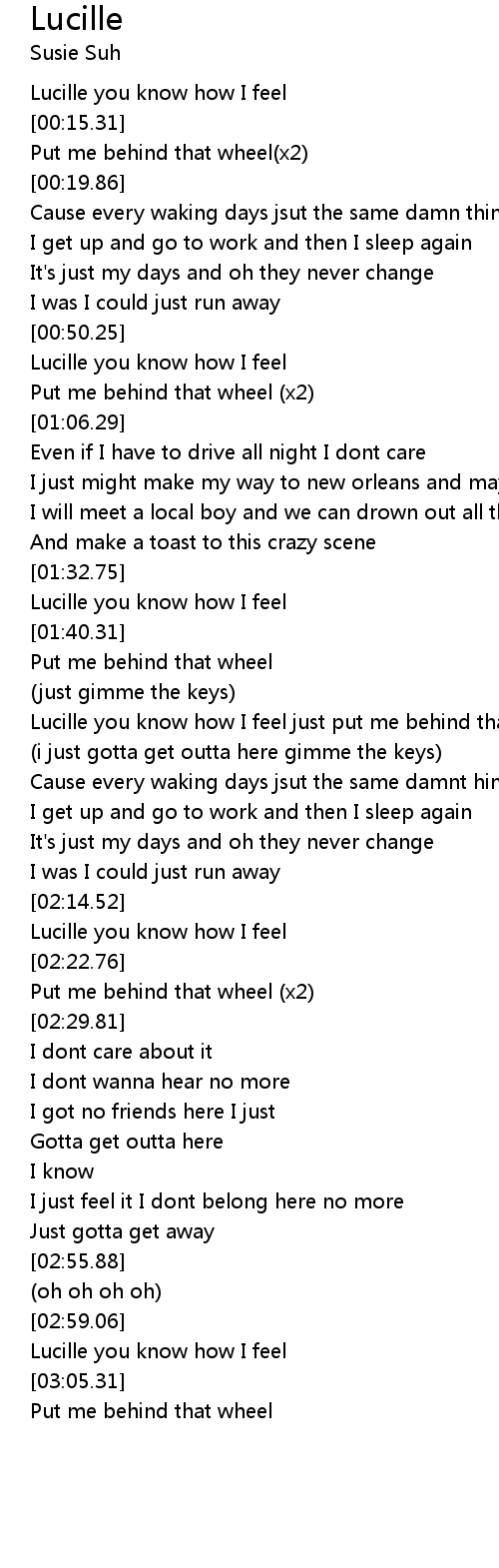 | [01:45.31] | Lucille you know how I feel just put me behind that wheel |