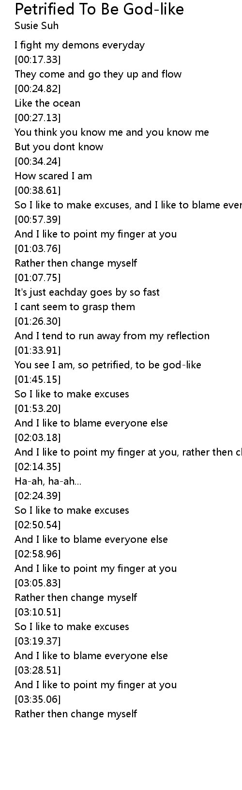 | [01:34.98] | You see I am, so petrified, to be god-like |