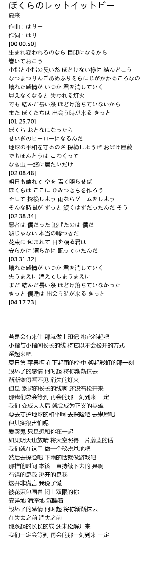 | [00:32.51] | 小指と小指の長い糸 ほどけない様に 結んどこう |