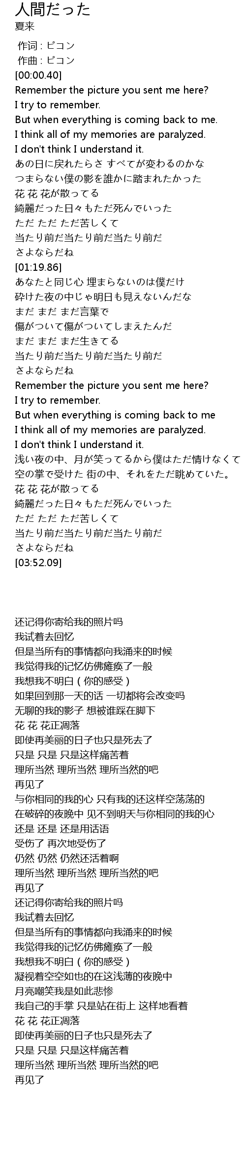 | [00:09.35] | I think all of my memories are paralyzed. |