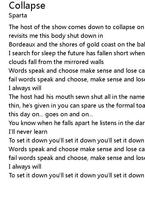 The host had his mouth sewn shut all in the name of trust when the blood goes thin, he's given in you can spare us the formal toast the drunken anecdotes from this day on... goes on and on... |