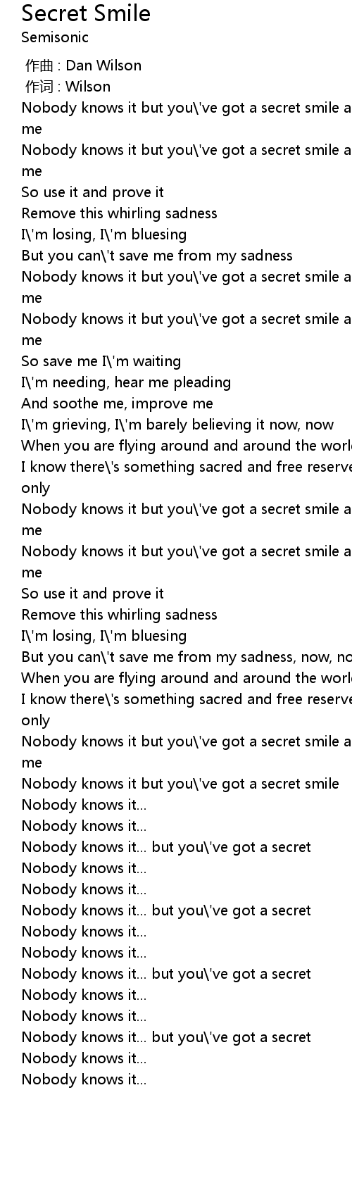 | [03:21.50] | Nobody knows it but you' ve got a secret smile |