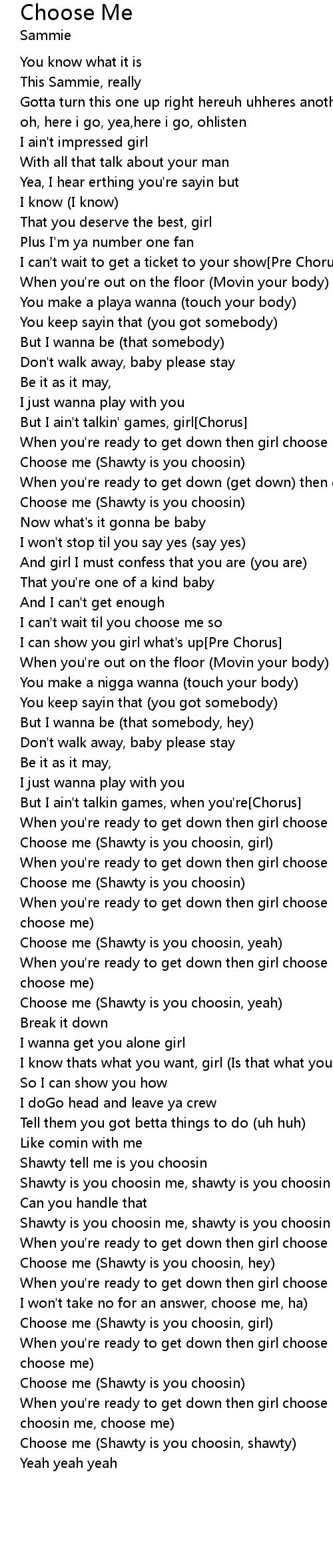 | Shawty is you choosin me, shawty is you choosin me(Sing it Sammie)[Chorus] | |