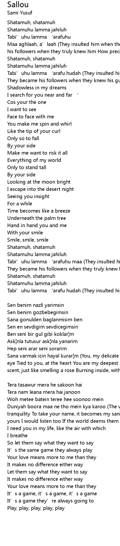 | Sana varmak icin hayal kurar¦m (You, my delicate Beloved You, the apple of my eye Tied to you, at the heart You are my deepest love, my Beloved Inhaling your scent, just like smelling a rose Burning inside, with the fire of your love I always look for, and ask of you Always dream of reaching you) [Urdu] | |