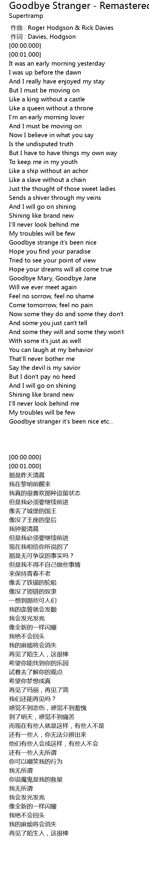 | [03:18.660] | Goodbye stranger it' s been nice etc... |
