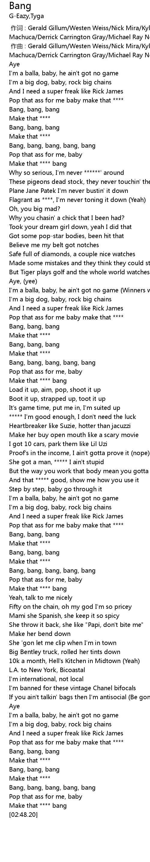 | [02:46.76] | Make that **** bang |