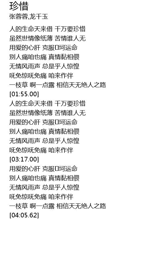 | [02:12.07] | 人的生命天来借 千万要珍惜 |