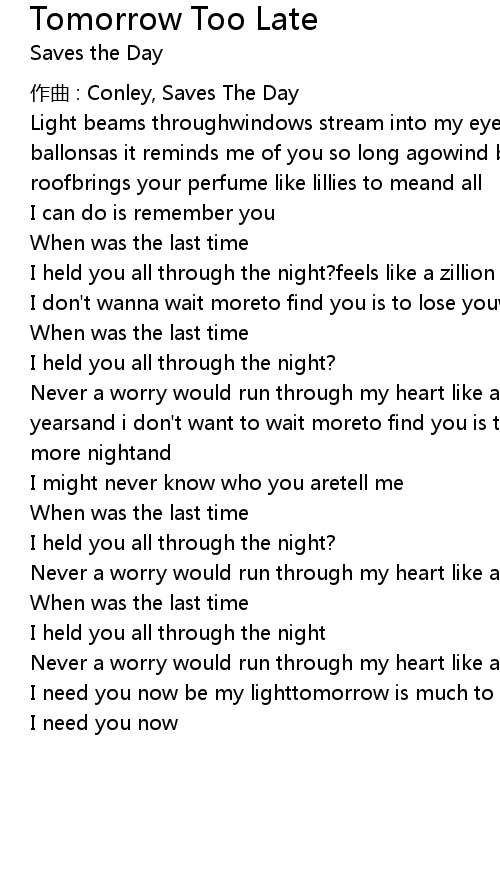 | Never a worry would run through my heart like a knifetomorrow is much too late | |