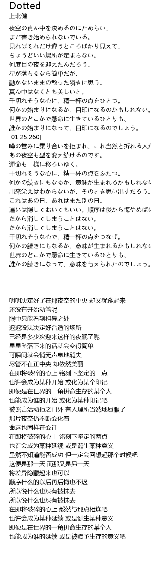 | [00:46.300] | 千切れそうな心に、精一杯の点をひとつ。 |