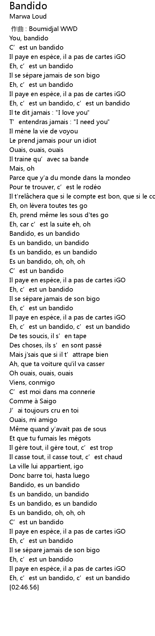 | [02:41.06] | Eh, c' est un bandido, c' est un bandido |