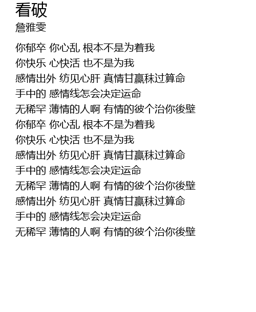 | [00:41.580] | gǎn qíng chū wài fǎng jiàn xīn gān zhēn qíng gān yíng mò guò suàn mìng |
