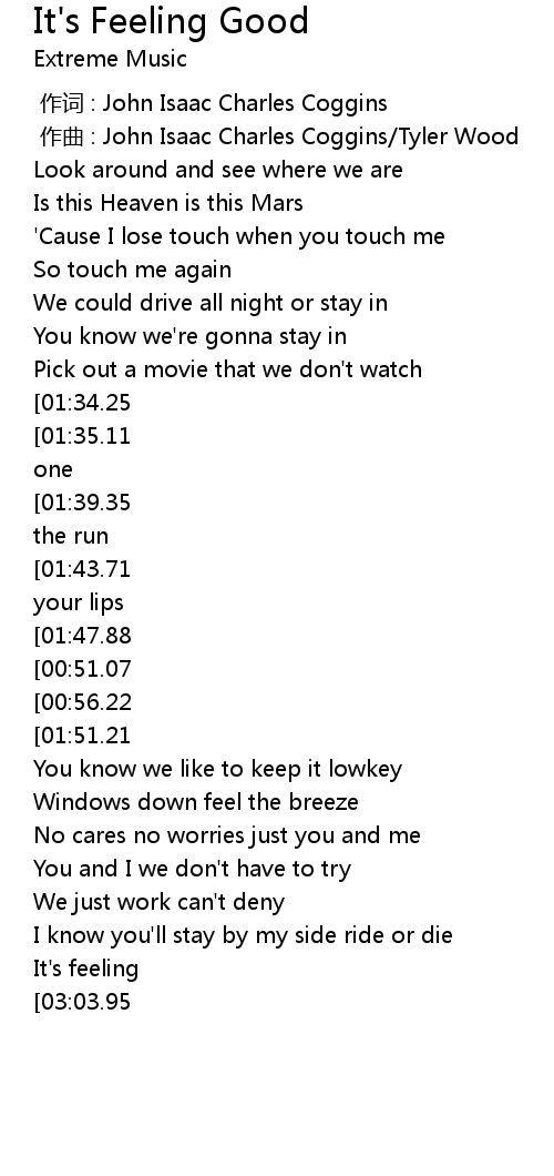 | [02:59.54][03:03.95][03:08.46][03:12.74] | It's feeling good good |