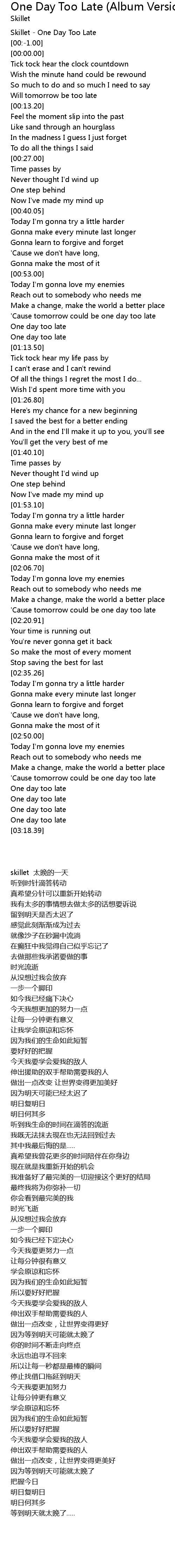 | [00:-2.00] | Skillet - One Day Too Late |
