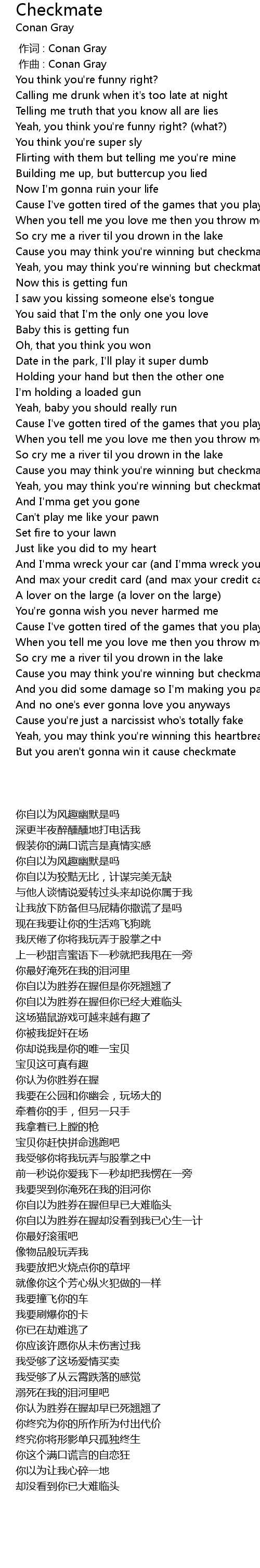 | [00:41.58] | Cause you may think you're winning but checkmate |