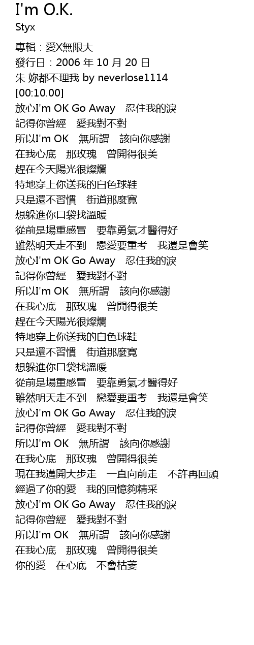 | [03:14.33] | 放心I'm OK Go Away 忍住我的淚 |