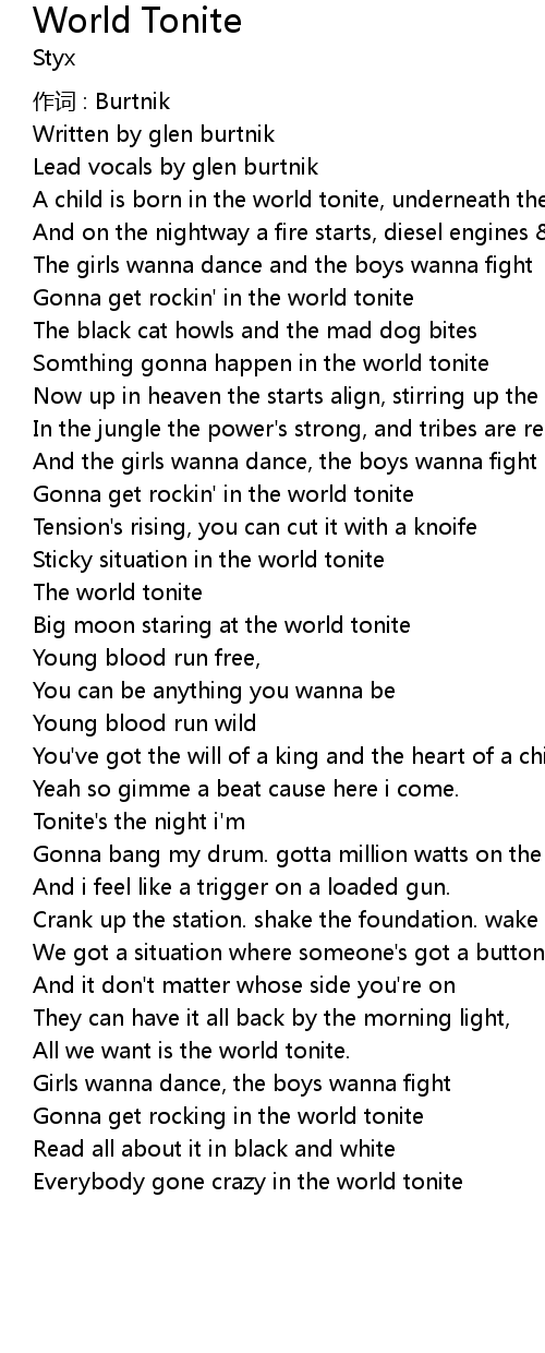 | Now up in heaven the starts align, stirring up the world tonite | |